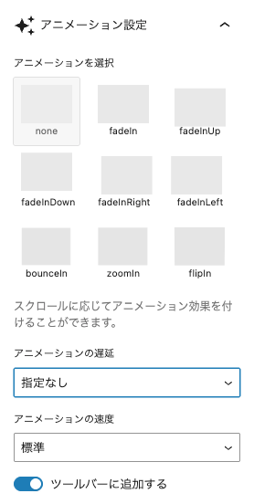 アニメーションを設定した要素(ブロック)が、ページスクロールで表示されてからアニメーションが実行されるまでの時間(秒数)を指定できます。