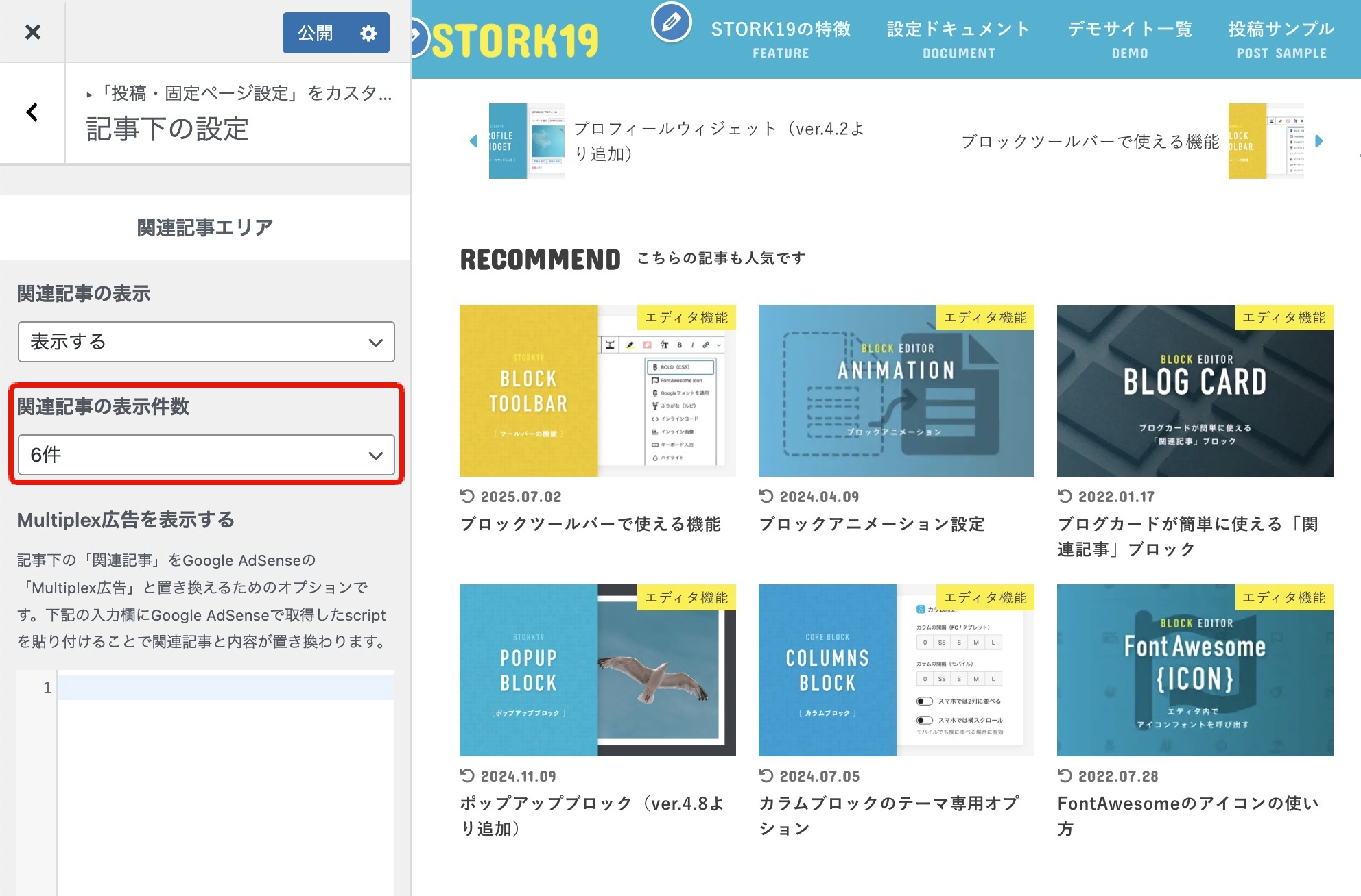 このオプションにより、投稿記事の下に表示される関連記事一覧(デフォルトは8件表示)の表示件数を4件 / 6件 / 8件 / 12件に変更できるようになりました。